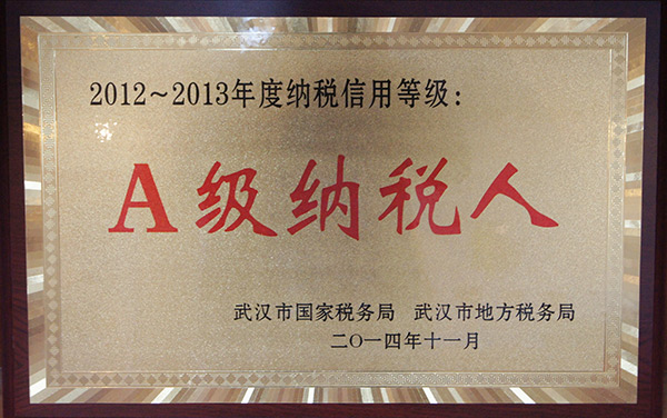 2014年獲得武漢市2012-2013年度“A級納稅人”獎項