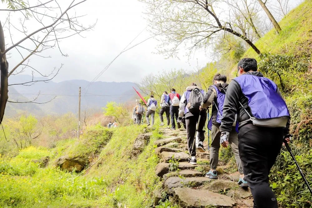 吳越古道為五代十國(guó)時(shí)期吳越(杭州臨安)與南唐(宣城寧國(guó))的主要通道,一路溪流陪伴,云霧繚繞。但同時(shí),長(zhǎng)達(dá)十幾公里的路程,路窄坡陡,跌宕難行。此次拓展的第二天便是徒步穿越吳越古道,體悟徽商吃苦耐勞、堅(jiān)持執(zhí)著的精神。